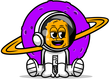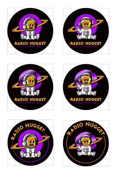 Des retouches ont été faites à la demande du client comme varier l'expression faciale du personnage, sa posture, la texture de la planète avec des cratères mais également un dégradé de couleurs et enfin rester sur les couleurs violet, orange, noir et blanc. La composition de la typographie en cercle a également été testée.