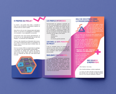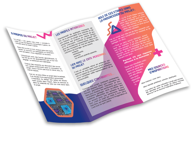 Ce document offre une vision complète du projet, intégrant un travail réflexif d’analyse de mes pratiques. Mais il m'a surtout permit d'apprendre à mettre en page sur un petit format toutes les informations nécessaires pour comprendre un projet tout en le rendant attrayant et dynamique par ses couleurs et sa composition.